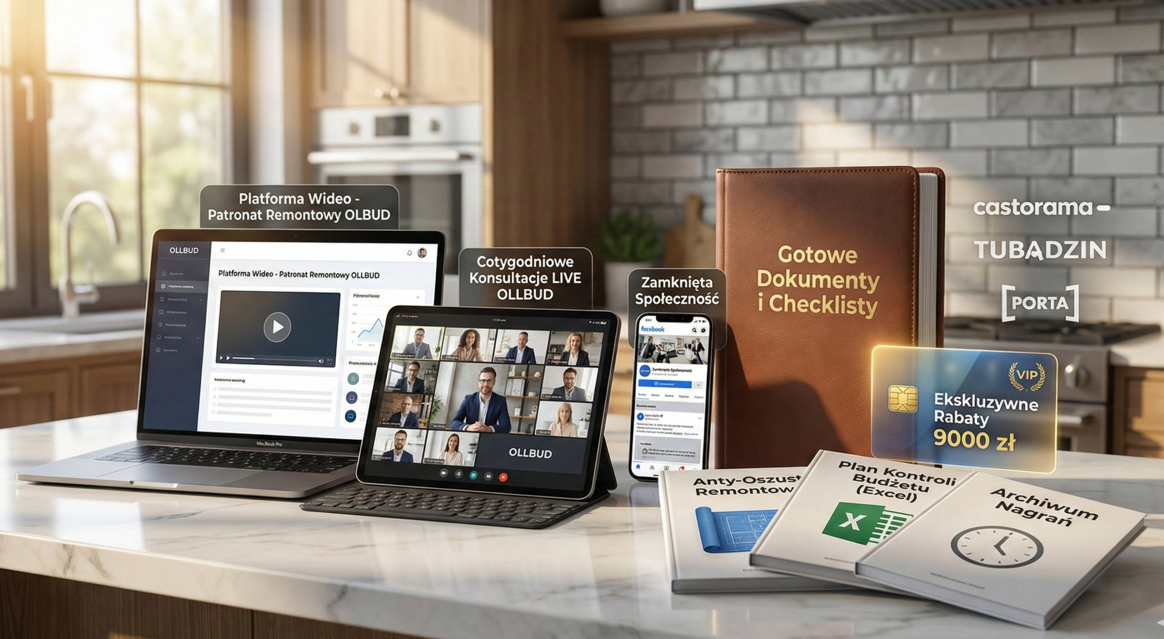 Przestań dryfować przez remontowy chaos i stań się Świadomym Inwestorem. Ten System Operacyjny chroni Cię przed stratą od 20 000 do 60 000 zł, której doświadcza 90% osób wykańczających mieszkanie lub dom. Nie sprzedajemy kursu – sprzedajemy spokój, kontrolę oraz opiekę nad Twoimi pieniędzmi i decyzjami. Dzięki unikalnym rabatom u naszych partnerów (m.in. Castorama, Tubądzin, Porta), program spłaca się sam jeszcze w trakcie trwania prac